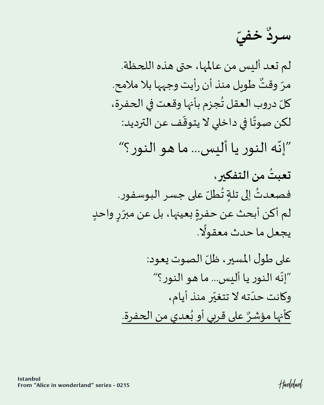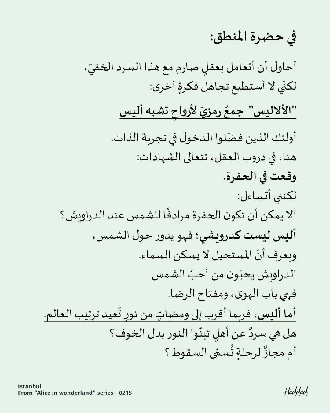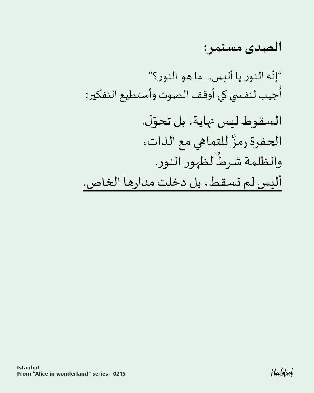 I answer myself, trying to quiet the voice so I can think. Falling is not an end, but a transformation. The hole is a symbol of merging with the self, and darkness is the condition for light to appear. Alice did not fall. She entered her own orbit.